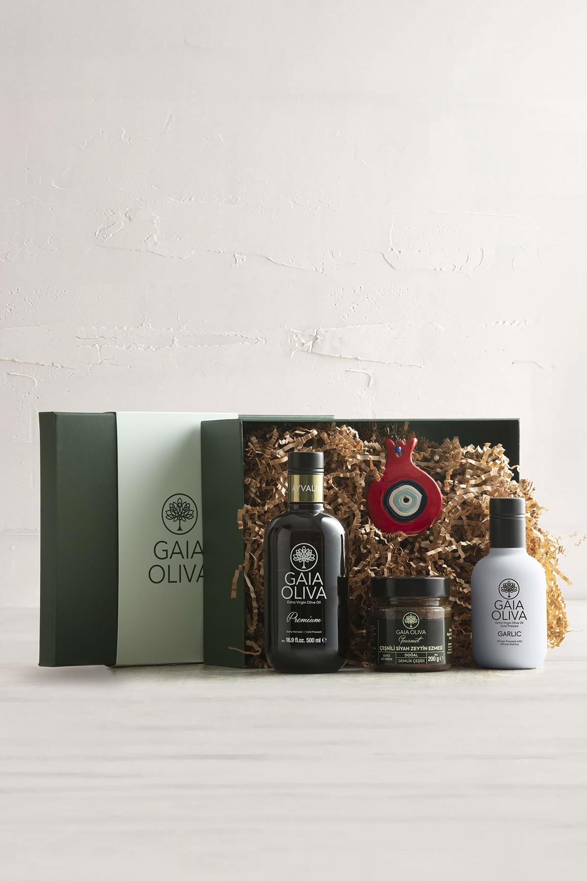 Sofralarda keyifle yerini alacak 500 ml Premium Ayvalık Erken Hasat Zeytinyağı, taptaze sarımsaklarla birlikte sıkılmış 250 ml Sarımsak Çeşnili Zeytinyağı, doğal zeytin ezmesi ve el yapımı kırmızı seramik nazarlık ile dolu bu set, sizin ve sevdikleriniz için özenle bir araya geldi.